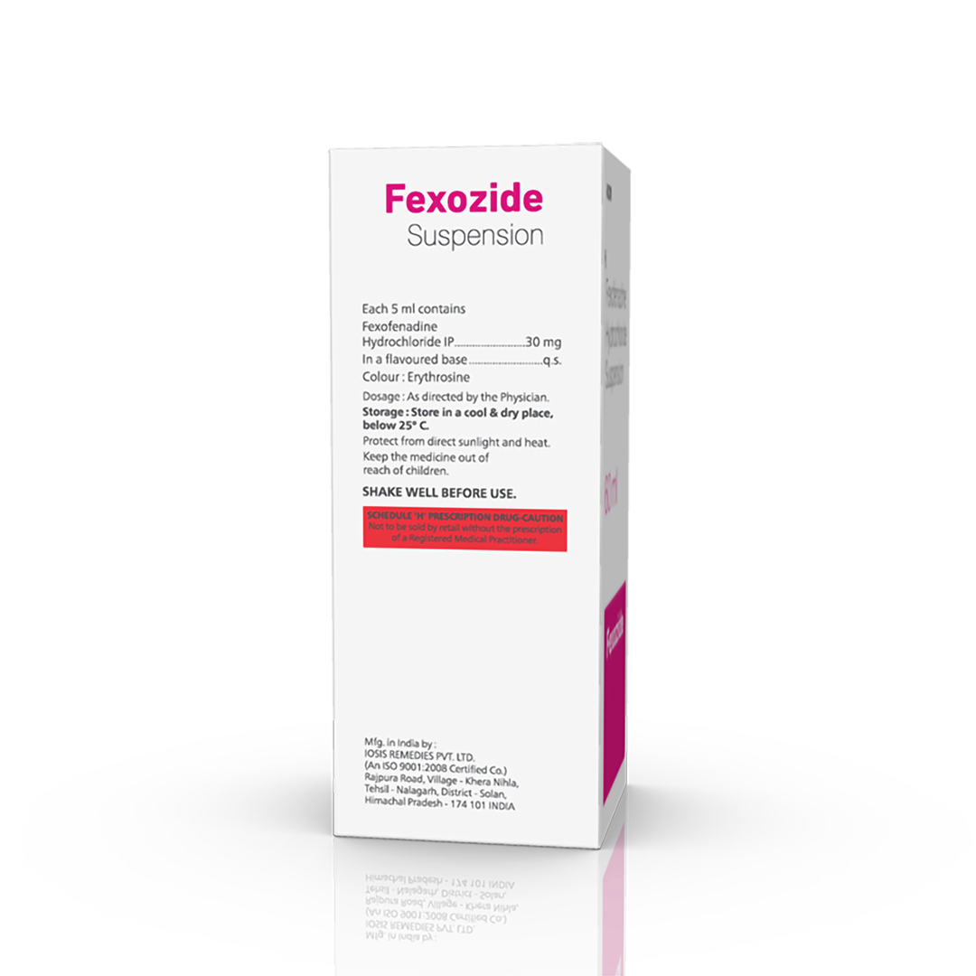 Fexozide Suspension is an anti-allergy medicine used in the treatment of allergic symptoms such as runny nose, congestion or stuffiness, sneezing, itching, swelling, and watery eyes. It also helps treat skin allergies with itching, redness, or swelling.